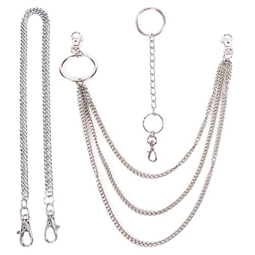 Details: Material: Stainless Steel. Size: Monolayer Long Chain,approx. 38cm*8mm/15in*0.31in;Three layers,One layer length:38cm/15in;Two layer length:48cm/19in;Tree layer length:58cm/23in (Approx.); Short chain,Length:app17cm/6.69inch. THREE TYPE DESIGN: Monolayer Long Chain,Tree Layer Chain,Monolayer Short Chain.Made for wallets keys belt loop purse with security.Good for managing your home keys, office keys, car keys, bike keys, motorcycle keys. APPLICATION The women mens wallet chain will be great to hang on jeans, and easily to hook on pant belt loop to keep wallet or keys from falling out of pocket.Wonderful choice to wear it for dancer, rock music, punk, hiphop lover. PERFECT GIFT: Perfect as business gift,birthday gift, christmas gift,it will be a great suprise for anyone who received. PACKAGE INCLUDE: 3 Pack Long Wallet Chain.(Monolayer Long Chain,Tree Layer Chain,Monolayer Short Chain)