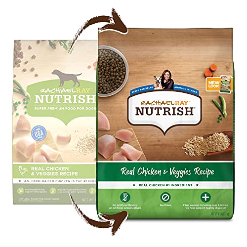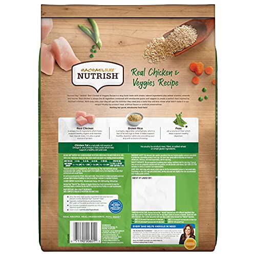 Details: Rachael Ray Nutrish Real Chicken & Veggies Recipe dry dog food, is a delicious, premium dog food recipe made the Rachael Ray way — with lots of love and only the best, high-quality ingredients. The #1 ingredient is real chicken, which is a good source of protein, helps support healthy organs and helps maintain lean muscle mass. Peas and brown rice, a highly digestible carbohydrate that's low in fat but high in fiber, help support healthy digestion while also providing your dog with a source of energy. Meanwhile, chicken fat is a naturally rich source of omega-6 and omega-3 fatty acids, which help support healthy skin and a healthy coat. All in a tasty and nutritious recipe dogs love! Better yet, a portion of the proceeds will be donated to The Rachael Ray Foundation™ to help animals in need. Order now to feed your fur baby well and help make a difference.
