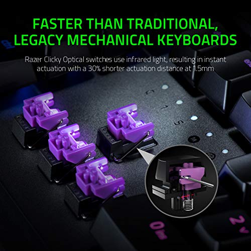 - Faster Than Legacy Mechanical Switches: Razer Optical switches use light-based actuation, registering key presses at the speed of light (30% shorter actuation distance than other clicky switches at 1.5 millimeter) with satisfying, clicky feedback