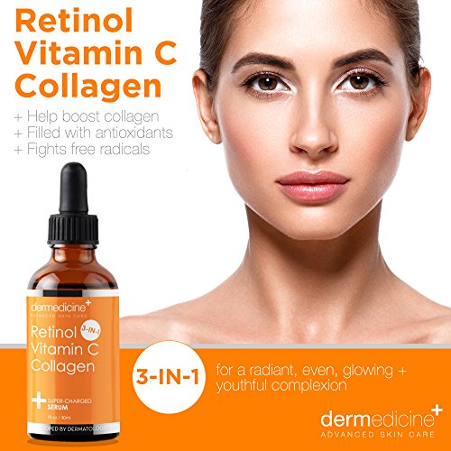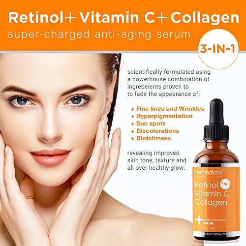 - 3 in 1 SUPER FORMULA TO BRIGHTEN & LIGHTEN: Our topical facial serum contains a blend of clinically proven ingredients to fight the signs of aging. Retinol, Vitamin C & Collagen work to help promote cell improvement helping to reduce appearance of hyper pigmentation, discolorations, age & liver dark spots, sun spots, pigment associated with hormones, birth control pills & daily sun exposure, tanning, sunburn, adult hormonal breakouts pregnancy. This potent blend leaves skin silky smooth & soft.
