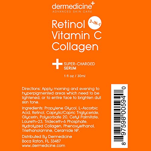 Details: Our serum will help your complexion appear more even, youthful and bright while helping to fade the appearance of fine lines and wrinkles, blotchiness and unevenness that becomes more apparent as we age. It is suitable for all skin types and tones including normal, sensitive, mature, older, fair to darker skin tones such as African-American, Asian, Latin, Indian and Mediterranean. To use, wash face using a cleanser and pat dry. Avoiding direct eye contact, apply a thin layer of serum to hyperpigmented areas which need to be brightened, or to entire face to brighten dull skin tone and allow to dry. Apply twice daily (AM / PM). Can be worn under moisturizer and makeup. Caution: Discontinue use if redness or irritation occurs. Do not ingest. Ingredients: Propylene Glycol, L-Ascorbic Acid, Retinol, Caprylic/Capric Triglyceride, Glycerin, Polysorbate 20, Cetyl Palmitate, Laureth-23, Trideceth-6 Phosphate, Hydrolyzed Collagen, Phenoxyethanol, Triethanolamine, Ceramide NP. MADE IN THE USA