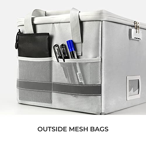 - 【Foldable & Special Design】: The fireproof storage box with lock can be easily folded and stored. The handles on both sides of the storage box are sturdy and easy to lift the storage box; 4 side pockets and a card slot can store some small items; a fireproof document bag with a fiberglass inner layer.