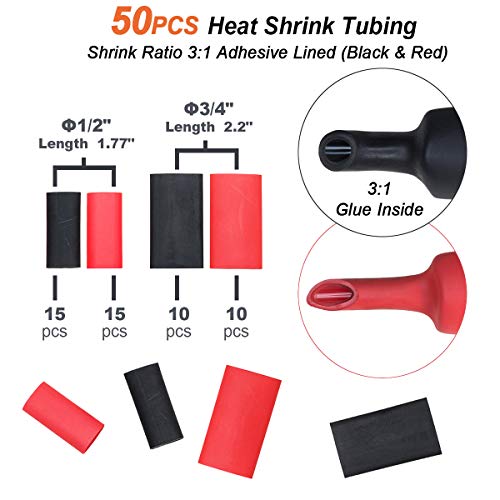 - Package: 10 sizes each 5 pcs total 50 pcs copper lugs, and 50 pcs 3:1 adhesive Lined heat shrink tubings, and 1 pcs clear storage box.