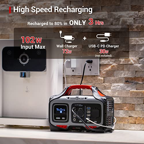 - POWERFUL PORTABLE POWER STATION: The latest ROCKPALS 300 is equipped with 280Wh (10.8V/26Ah, 78000mAh) lithium-ion battery pack, has enough power to charge iPhone 12(5.4 inch) about 28-29 charges, iPad Mini about 14 charges, 12'' MacBook (41.4wh) about 5-6 charges, Mini car refrigerator (40W) about 5-6 hrs, Gopro (5.9wh) about 40 charges or other small home appliances. This portable battery can meet all your needs in road trip, power outages and other emergency situations (especially hurricane)