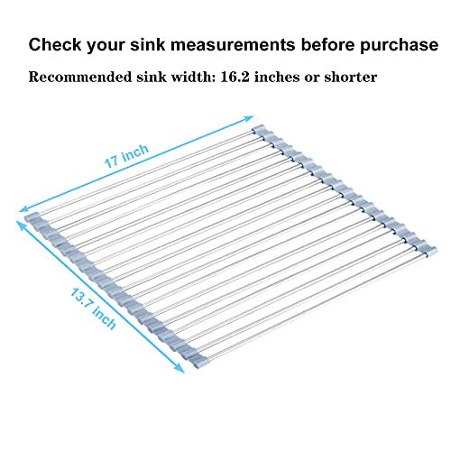 - OVER THE SINK DRYING RACK : 17 x 13.7 inch. Suitable for most kitchen sinks and counter. One of the great kitchen gadgets for a tidy kitchen and cozy home. A great addition to kitchen accessories and apartment necessities. Please measure your sink size before purchasing this roll up dish drying rack over sink!