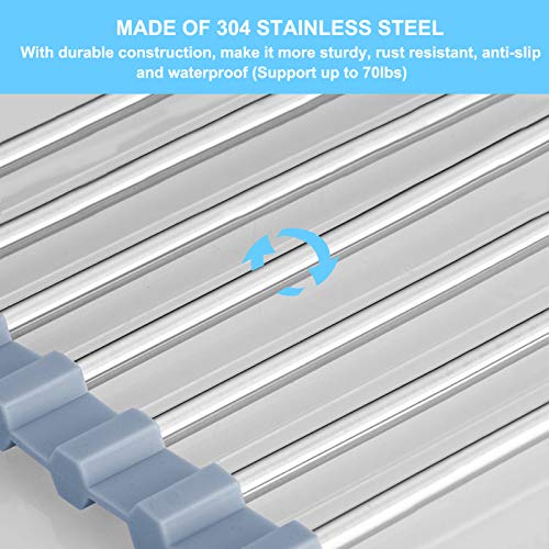 - HIGH QUALITY : Made of 304 Stainless Steel with durable construction, the collapsible dish drying rack over sink is sturdy, rust resistant,non-slip, waterproof; support up to 70lbs, not easy to bend or twist by heavy cookware. Great apartment essentials and home accessories.