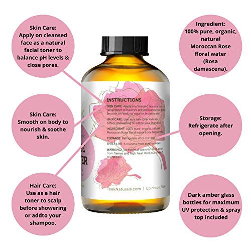 - PURE FLOWER TONER - Calm irritated skin, face, body, and hair and balance your pH with our 100% Pure Teak Naturals Moroccan Rose Water. Our Organic Rose Water works well with acne prone skin, hand spots, dark marks, and combination-oily skin. Balance your skin naturally with a botanical astringent of natural Rose Water. The natural smell of roses gives away that this product is made from rose flowers. Rose Water is a natural hydrosol, reduces redness, and used as a liquid toner.