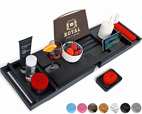 Details: Indulge Yourself To The Most Relaxing Bathtub Experience And Enjoy A Luxurious Home Spa Treatment. Black Bamboo Water Resistant Bathtub Caddy Tray Organizer for Bath Stuff and Electronics Accessories. Features: Adjustable reading stand with rear cover to protect small tablets Candle stand for aromatherapy Slot for Drink Glass 2 Side Detachable Trays for Bath Stuff Slot for iPad Mini or Cell Phone FREE Soap Holder Arms Slide Out from 29 ½ inches when closed, up to 43 inches extended. It is adjustable and suitable for most types of bathtubs.Easy Reading and Viewing - Our stainless steel reading rack can be adjustable in 3 position for ideal viewing angle of your book, magazine, e reader or tablet.Bath Friendly: Designed to be resistant to water and comfortable to use in the bathtub.Best way to Serve: surprise your spouse by servicing everything at a time.Organizational and Functional: Plenty of compartments, slots, and trays for different stuff to use.Highest Quality Eco Friendly Organic Bamboo that will last.The Perfect Gift! It can be the most appreciated gift for every new house owner or new family as Wedding gift!Customer Support: Our Customer Service works 24/7, ready to help with any issue.Treat yourself with Luxury Lifestyle. Get yours Today!100% Risk Free Money Back Guarantee