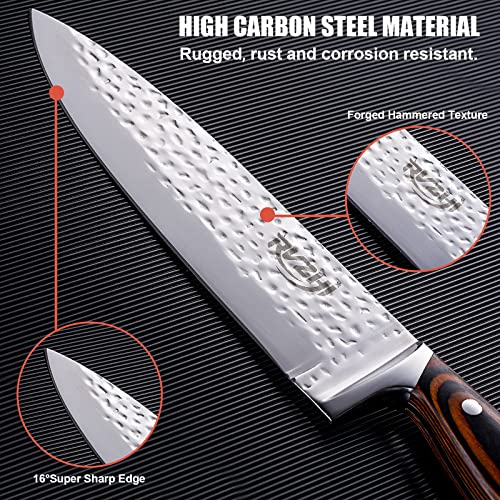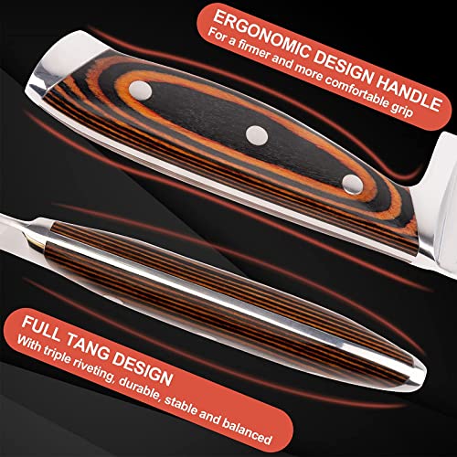 - ERGONOMIC DESIGN: The handle adopts a triple riveting structure, which is sturdy and durable, and the natural wood grain is more beautiful. The perfect combination of precision stamping structure and full-tang design achieves the best balance and cutting precision, bringing a comfortable feel and non-slip grip, reducing fatigue.