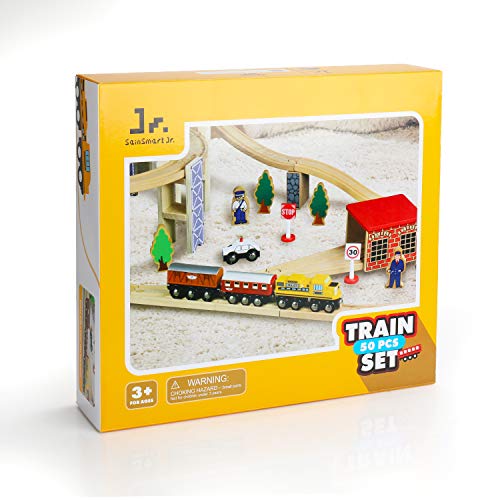 Details: Happy playing time with SainSmart Jr. wooden deluxe train set building a rail high-level train set with parents, enjoying hours of happy family time together, creating a unique train empire which belongs to you. Inspiring kids’ hand and eye coordination, improving their problem solving skill and keeping their mind active with this awesome flyover overpass train set! choosing the wooden flyover overpass as the first train set gift for your beloved kids, let them enjoy the busy playing time now. specification: Item name: SainSmart Jr. 50pcs wooden train set materials: birch and beech wood recommend ages: 3+ years quality : fully tested to the highest U.S. Astm & CPSC toy safety standards. what you get: cars & trains x 5 trees & building pieces x 7 people & Signs x 4 track pieces x 25 bridge support x 9