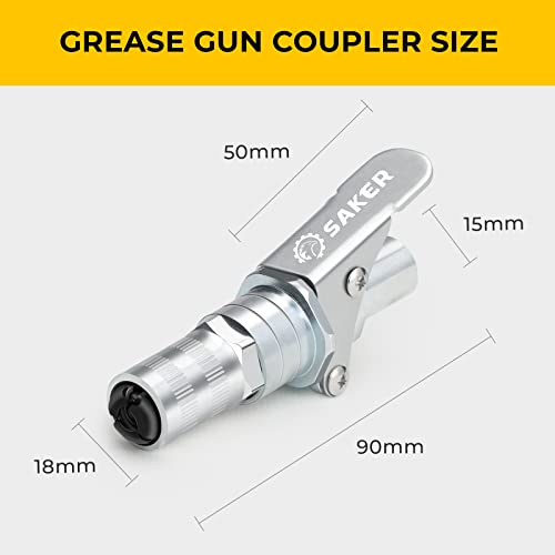 - 【Wide Application】The Saker portable grease gun coupler fits all 1/8 NPT standard grease guns, mini grease guns,It also fits all DIN and SAE grease fittings,simply replace your existing grease gun couplers.This heavy-duty tool is an excellent device to have on a construction job site or in an auto mechanic garage to use on your large machinery.It is also a great lubrication tool to have at the farm for your tractor, plow,stump puller,disc harrow,seeder,etc.