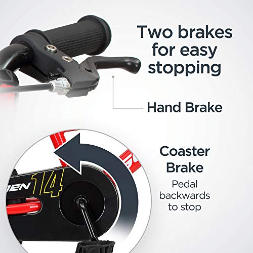 - Designed with younger riders in mind, this bike includes a rear coaster brake (reverse the pedals to stop) and a front caliper brake (hand-brake like adult bikes); easing the transition to a hand-brake-only bike when they’re ready.