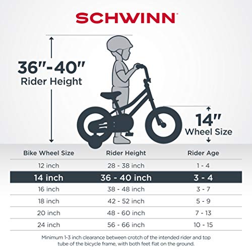 - This Schwinn Koen boy's bike with 14-inch wheels is designed for children 3 - 4 years old or 36 - 40 inches tall. The Koen is perfect for riding to the park or riding on the sidewalk around the neighborhood.