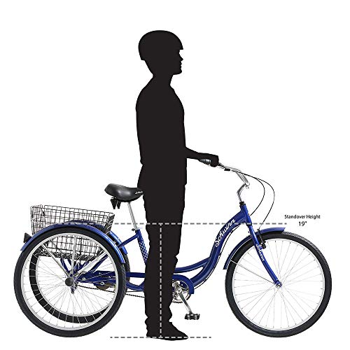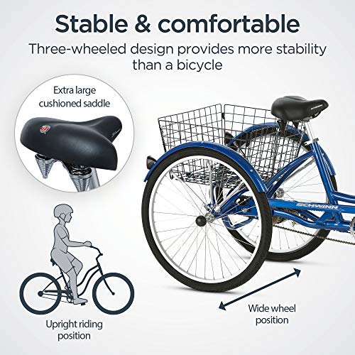 Details: Product Description The Schwinn Meridian adult tricycle is a single-speed cargo trike and has a super low step-through aluminum frame, classic swept back handlebars for a relaxed, upright riding position, and adjustable springer cruiser seat for comfortable riding. The full fenders are stylish and helpful for keeping you clean and dry and the alloy rims help keep the ride light and smooth. The best part is the huge rear folding basket, capable of bringing home a week's worth of groceries or taking an entire picnic to the park. If you need a daily hauler you can depend on, look no further. The Schwinn Meridian's extra large mesh basket lets you haul farmer's market finds or new antiques for the den. Put the car away and take the Meridian for some of those extra trips. Enjoy the freedom of riding a Schwinn. Amazon.com Cruise around in comfort and style with this easy-to-use, single-speed three-wheeled Schwinn Meridian bike. The bike features a low step-through frame, an upright handlebar, padded cruiser saddle, and front and rear brakes. Perfect for rides around town or through the park on a warm, sunny day, the bike features a folding rear basket to stash your picnic lunch or extra jacket. The Meridian also offers a lightweight aluminum frame for a comfortable and stable ride. Key Features: Frame Type: Tricycle cruiser Frame Material: Aluminum Gearing: Single speed Brakes: Rear band brake with front linear pull brake Wheels: Alloy rims with stainless steel spokes About Schwinn Founded in 1895, Schwinn is an American icon that has been synonymous with quality and innovation. They have built some of the best-known and best loved bikes of numerous generations--Aerocycle, Paramount, Phantom, Varsity, Sting-Ray, Krate and Homegrown. Today, Schwinn continues to be a leader in the industry with innovative bikes such as the new Sting-Ray, Rocket mountain bikes, and Fastback road bikes. With a continued dedication to quality, forever synonymous with the Schwinn name, America's most famous bicycle brand looks forward to providing another century of innovation, freedom and performance to people of all ages. Amazon.com Bicycle Buying Guide Finding the Right Bike To really enjoy cycling, it's important to find a bicycle that works for you. Here are some things to keep in mind when you're in the market for a new bike: The Right Ride In general, bikes are broken down into three major categories: Road and Racing Bikes--As a general rule, road and racing are built for speed and longer distances on paved surfaces. Thinner tires, lightweight 29-inch (700c) wheels and drop bars that allow for a more aerodynamic position are the norm. Most road bikes, regardless of price, offer many gears for tackling both hilly and flat terrain. Mountain Bikes--With their larger tires, hill-friendly gearing and upright position, are very popular for all types of riding, both on pavement and off. Mountain bikes that are designed specifically for rugged trail use typically feature a suspension fork. Some may have rear suspension, as well. A quick change of the tires on any mountain bike--even one that you use regularly on trails--adds to its versatility and makes it a worthy street machine. Comfort/Cruiser Bikes--For tooling around on bike paths, light trails, or for cruising a quiet beach-side lane, are the ticket. With a super-relaxed riding position, padded seats, and limited or no gearing, these bikes are made for enjoying the scenery and having fun with the family. The Right Price A bike's price boils down to three essentials: frame materials, bike weight, and component quality and durability. Entry-level--You'll find a wide range of comfort and cruiser bikes in this category, as well as some lower-end mountain bikes and road bikes. Most will have steel frames and components that are designed to last for several years with frequent use. Mid-range--Bikes in this range may feature a lighter aluminum frame with mid-range components that