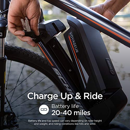 Details: What if you could focus on the fun of cycling without worrying about climbing steep hills or running out of steam on longer distances? Now you can with the Voyageur e-bike by Schwinn. The Voyageur electric bike features an aluminum comfort-tuned geometry frame that allows for a more upright and natural rider position and the hydro-formed down-tube keeps the voyageur's battery as low as possible For better stability and control. With the SR sun tour coil-sprung suspension fork with lockout you can tune your Voyageur to your comfort level: Shock absorbing for rough roads or fully rigid for smooth paths. The Shimano 8-speed drivetrain keeps you spinning along smoothly and the aluminum Tektro mechanical disc brakes deliver precision stopping power in all conditions. The Voyageur includes 250-watt Bafang max drive mid Drive motor that provides 5 levels of pedal assist. Just choose your level of assist on the handlebar-mounted LCD display, and the motor will put that much extra oomph behind every pedal stroke. Plus, the Schwinn Voyageur comes with 2-year on battery and electric assist parts, and a lifetime on the frame and fork. Get more fun out of your ride with the Voyageur electric bike. Enjoy the freedom of riding a Schwinn.