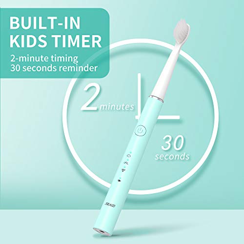 - 3.ERGONOMICS AND INTELLIGENCE -- The body with ergonomic design, comfortable size, easy to hold, designed for small hands, non-slip, more effort-saving and convenient use, the sonic toothbrush comes with 30 seconds smart reminder, 2 minutes automatic shutdown and smart memory function, 2-minute timer to help children develop a scientific way to brush their teeth.