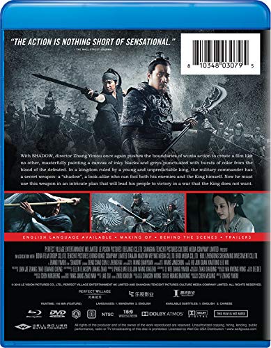 Details: Product Description With SHADOW, director Zhang Yimou (HERO, HOUSE OF FLYING DAGGERS) once again pushes the boundaries of wuxia action to create a film like no other, masterfully painting a canvas of inky blacks and greys punctuated with bursts of color from the blood of the defeated. In a kingdom ruled by a young and unpredictable king, the military commander has a secret weapon: a shadow , a look-alike who can fool both his enemies and the King himself. Now he must use this weapon in an intricate plan that will lead his people to victory in a war that the King does not want.Language: Mandarin, English DubSubtitles: Chinese, EnglishThis item includes a Blu-ray and DVD disc. Review "An enthralling, inventive, rapturous descent into utter madness" --Birth Movies Death"Bombastic martial arts wuxia replete with duels of breath-taking beauty that will please longtime Zhang acolytes and newbies alike." --The Film Stage"The action scenes are among the best that Zhang Yimou has ever shot" --Birth Movies Death