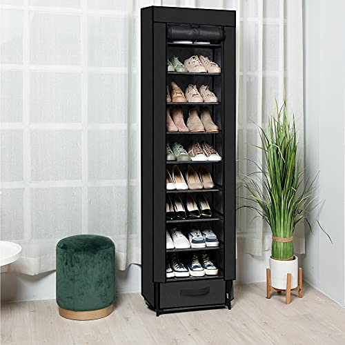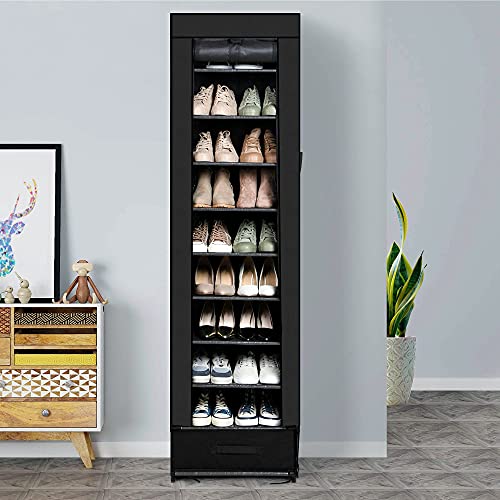 - [ Makes vertical shoe rack organizer better use of a small space ] - The compact shoe rack tall narrow takes up very little floor space and free standing shoe racks for closets, entryway, dormitory, apartment, hallway, wardrobe, or some other temporary space,also as garage shoe rack small space. The shoe rack covered 10 tier shoe tower organizer, as entryway shoe rack or shoe shelf for closet, or front door shoe rack zapatera organizador.