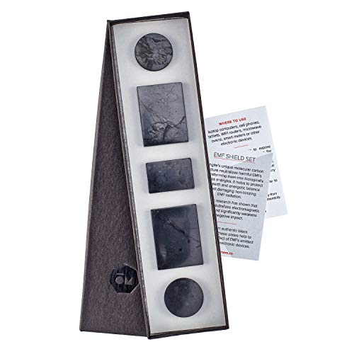 Details: SHUNGITE EMF SHIELD KIT by Modern Om Protect yourself and the ones you love from harmful EMFs Every day we are in close contact with our cell phones, smart meters, and electrical appliances and the electromagnetic fields (EMFs) they emit. Background technologies like wireless routers, Bluetooth and other wireless systems give off radiation in the low-gigahertz frequency range that are potentially dangerous to humans and animals. A real-world example: when your cell phone is turned on, or in stand-by mode, it emits EMFs. When you hold it to your ear, 20% to 80% of the radiation from its antenna penetrates your brain (up to two inches). To help you guard yourself and loved ones against EMF radiation, we’ve created a EMF Shield Set using Shungite. Shungite is a rare mineral with a unique molecular carbon structure that neutralizes harmful EMFs by transforming them into biologically harmless energies. We use verified authentic black SHUNGITE plates to mitigate the effect of EMFsfrom electronic devices. The kit includes 5 polished sticky-backed Shungite plates for you and your family to attach to laptop computers, cell phones, tablets, WIFI routers, microwave ovens, or smart meters. It’s wise to shield your health and energetic balance from damaging non-ionizing EMF radiation. Please Note: Someplates have mineral inclusions (light spots or reddish-brown veins) which are primarily pyrite or iron oxide that naturally occurs in Shungite. They are harmless and contribute to the beauty of each piece. Because of its high carbon content, your new Shungite piece may shed some black residue on skin, clothing or other surfaces. This is normal and harmless. The residue can easily be washed off most surfaces. Wiping the object with a soft damp cloth will remove any loose carbon dust and minimize this effect.