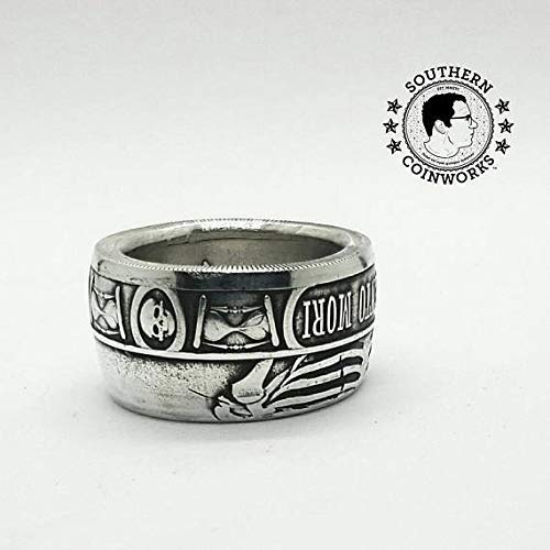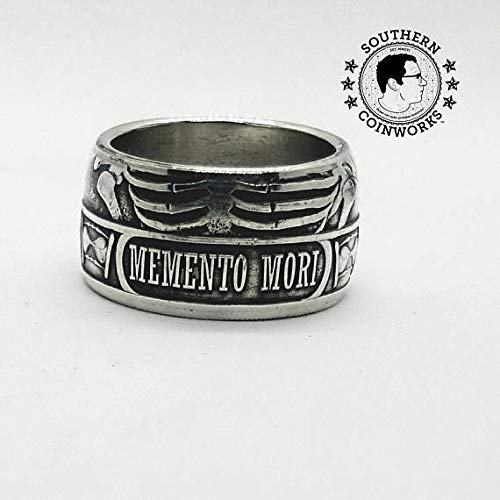 Details: ription Memento Mori, Coin Ring, The Last Laugh, Handcrafted, 1oz .999, Pure Silver, Unique Ring, Skull, Cross Bone, Coin Jewelry, Mens, Band, Rings, Mens wedding band. The Memento Mori .999 Pure Silver Coin Ring. Latin for "remember that you have to die" an iconic reminder of our mortality. The coin features a funeral themed design of death laughing. The coin starts as a .999 fine silver coin with a diameter of 39.3 mm, comparable to a Morgan Dollar in size. So pick up your silver Memento Mori coin ring today. coin ring silver coins rings for men vintage wedding bands unique band quarter mens jewelry gift