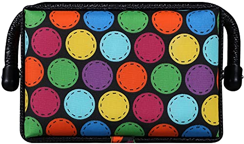 - Miniature sized sewing basket in bright dots print with basic sewing notions