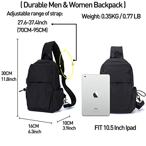 Details: construct: weight :0.35 kg / 0.77 lb dimensions: 11.8 x 8.7 x 3.9 inches/30*22*10cm (l x w x h). material:waterproof nylon color:black sling bag large capacity: 1, large main zippered compartment is compatible with 12.9 inch ipad, newest kindle, samsung tab or tablets 2, the front zippered pocket one for phones, power bank, wallet or outdoor/travel sundries. 3, each drawstring side pocket in each side for water bottle (up to largest diameter 2.5 inch). 4, buckle closure can hang towel or clothes when having a walk or travelling outside. durable and sturdy, water-resistant black sling backpack is ideal for hiking, cycling, walking, hunting, camping, travel, work, college and school. great gift for women, men, boys, girls, kids. 1.black sling backpack is ideal for everyday use, especially if you ride a bike to work or school. they're also well-suited to hiking and camping trips. 2.unisex black sling backpack bag can be used as chest bag, sling bag, travel bag, cross body backpack, shoulder backpack, casual daypack, sling pack bag. 3.if you´d like to travel, hike, or climb, you can carry our lightweight sling backpack. this sling bag can hold all your belongings and stuff. 4.sling bag has padded shoulder straps to ensure you are comfortable, even if you wear the backpack all day, and there´s a breathable mesh in adjustable strap so that you don’t overheat. 5.the sling shoulder backpack also has an adjustable strap, so it can easily be altered to fit the shape of your body. this sling bag backpack is suitable for most of people.