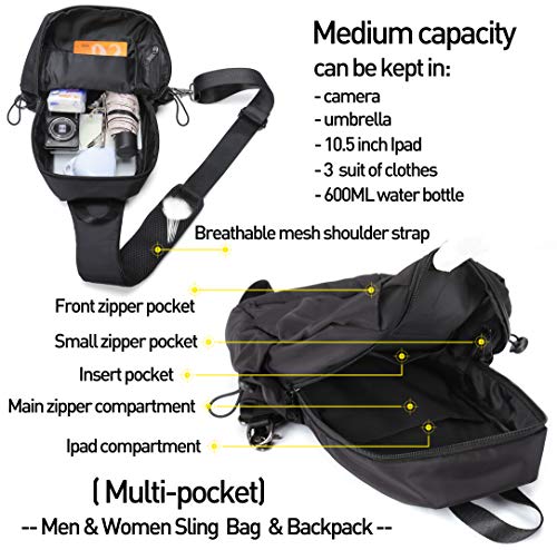 - Multi-occasion: sling pack bag for women & men is perfect for multi-occasion. sling backpack bag for hiking walking biking cycling hunting travel school business gym camping beach and everyday using. perfectly works as sling shoulder pack bag, wear this black sling bag over either shoulder comfortably, or across the chest to deter thieves and keep your hands free. if buyer meet any problem with product, looking forward to ur message!!