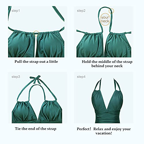 - Design : Our swimsuit can shift wearing style between sexy V Neck and modest keyhole in seconds. Halter One Piece Swimsuit with Ruched pattern in the torso accentuates your curves and hides imperfections while still being flattering.