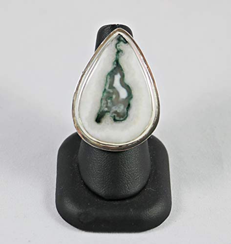 Details: A large pear shaped solar moss agate cabochon has been bezel set into sterling silver. The greens really come through on this piece. The clear center add depth and design to this ring. The band is adjustable in size from large to small fingers, but once the sturdy band is set, it will not move around on your finger like other flimsy adjustable bands. The ring has been stamped with my makers mark and 925. Ring size 1.5 x 1 inches