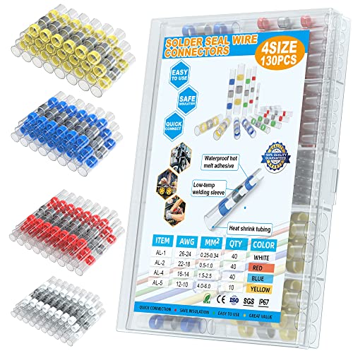 Details: Why choose our solder seal wire connectors? 1.Most simple and effective way to connect wires quickly. 2.Pretty easy to use wire connectors. 3.Waterproof and insulated wire terminals with a great assortment. 4.Abrasion resistance and environmental protection heat shrinkable tube and premium solder seal ring. Package Include: 40 x White Connectors: Diameter 1.7 mm, Cable cross-section 0.25-0.34 mm²(A.W.G.:26-24); 40 x Red Connectors: Diameter 2.7 mm, Cable cross-section 0.5-1.0 mm²(A.W.G.:22-18); 40 x Blue Connectors: Diameter 4.5 mm, Cable cross-section 1.5-2.5 mm²(A.W.G.:16-14); 10 x Yellow Connectors: Diameter 6.0 mm, Cable cross-section 4.0-6.0 mm²(A.W.G.:12-10). We offer a 30-day money-back guarantee,and a 12-month replacement warranty giving customers a 100% Satisfaction Guarantee for risk-free purchases!