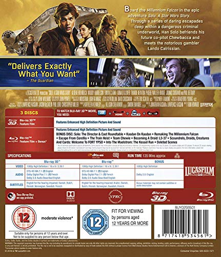 Details: Board the Millennium Falcon and journey to a galaxy far, far away in “Solo: A Star Wars Story,” an all-new adventure with the most beloved scoundrel in the galaxy. Through a series of daring escapades deep within a dark and dangerous criminal underworld, Han Solo befriends his mighty future copilot Chewbacca and meets the notorious gambler Lando Calrissian, in a journey that will set the course of one of the Star Wars saga’s most unlikely heroes. Bonus Content: Solo: The Director & Cast Roundtable Kasdan On Kasdan Remaking The "Millennium Falcon" Escape From Corellia The Train Heist Team Chewie Becoming A Droid: L3-37 Scoundrels, Droids, Creatures And Cards: Welcome To FORT YPSO Into The Maelstrom: The Kessel Run Deleted Scenes: Proxima's Den Corellian Foot Chase Han Solo: Imperial Cadet The Battle Of Mimban: Extended Han Versus Chewie: Extended Snowball Fight! Meet Dryden: Extended Coaxium Double-Cross