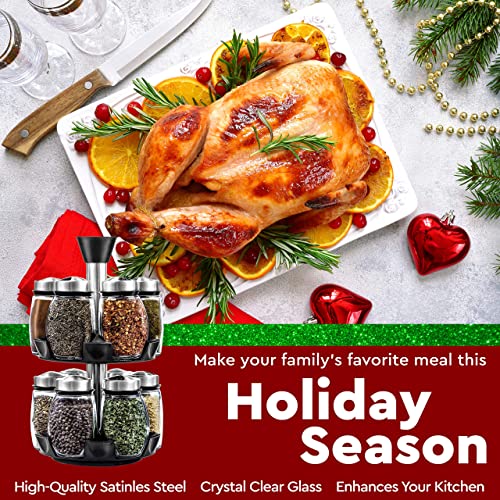 - [ 3 Opening Sizes ] Sprinkle, shake or pour from the jars in the spice holder by using any of the three differently sized openings. If you find your finely ground spices make it harder to turn the cap, you can unscrew the cap to tap them out, rinse them (dry before screwing back), or just pour from the bottle without the lid.