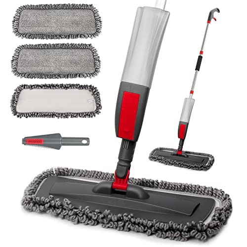 - Professional Spray Mop - 360° rotating floor mop head easily reach into deep corners of sofas, bed and other furniture. The pole is made from durable, high purity aluminum, sturdy and reliable. Ergonomic handle, easy to grip for One hand operate. No bend over for the lengthened pole, relaxed your back. With super wide spray mop head, you can quickly finish floor cleaning and have more time enjoying your life.