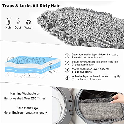 - 3 Upgraded Reusable Mop Pads - The spray mop comes with 3 larger, thicker and more strong adsorption microfiber pads. New microfiber floor mop pads are soft,absorbent and durable for wet and dry use to collect dust, hairs and debris easily. The microfiber pads are washable for 200x times in the machine, just throw the pad in the washing machine when it is dirty. Our spray mop saves not only a lot of disposable floor wipes but also so much time and effort!