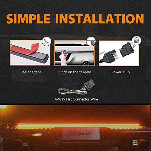 Details: SS VISION is a leading manufacturer of advanced lighting products and accessories with high performance. We strive to provide innovative lighting solutions at wallet-friendly prices and keep you safe wherever you go. Your trust and recognition are our driving force to make better! All our product adopted latest technology to provide bright and vivid illumination to serve you for years to come. Why Choose Our Triple Tailgate Lights 60-inch led chips triple LED tailgate lighting bar is universal fitted for most Pickup Trucks, Trailers, Cars, SUV, RV, VAN, etc. It allows you to mount them along the tailgate as left/right turn signal lights, brake light, reverse light, running light and emergency strobe light. Powered by super brilliant LED lights, makes you easily seen by others behind you even in thickest traffic in day or at night. Flat 4 Pin Connector wiring diagram for reference: Brown Wire: Ground White Wire: Running Light Yellow Wire: Left Turn Signal & Brake Light Green Wire: Right Turn Signal & Brake Light Red Wire: Reverse Light Yellow + Green: Strobe Light Please read the instruction paper thoroughly before any operation and installation on the light strip. Professional installation is highly recommended.