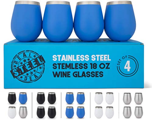 Details: ELECTROPOLISHED INTERIOR: Unlike other portable wine glasses, our 4 pack of stemless stainless steel wine glasses has a electropolished interior to guard against corrosion. Rust in your wine, gross! Make these virtually unbreakable no stem glasses your go-to glassware for outdoor events and family gatherings THE PERFECT SIZE:These large 18 ounce single wall wine tumblers give you enough capacity to swirl your favorite wine in the glass while still fitting comfortably in your hand. They are crafted in a unique bulbous shape that allows your wine of choice to properly breathe and concentrates the aromas up to your nose. Plus, no more spilling those tiny tumblers!DURABLE POWDER COAT FINISH: These colored stainless steel wine glasses are eyecatching and modern. Unlike painted tumblers, the powder coat color won't fade, peel or crack and is scratch resistant. These stemless wine glasses will add a pop of color to your cabinet. Great gift for wine lovers. HIGH QUALITY STEEL: Ultra durable and shatter proof, these wine glasses are made from 100% food grade 18/8 steel that's BPA and toxin free so they won't tarnish, rust, or leach harmful chemicals over time RED, WHITE, OTHER: Our elegant stainless steel stemless wine glasses are ideal for your favorite white and red wines, or you can use them for sangria, hard seltzer, hard ciders or any other favorite drinks
