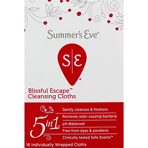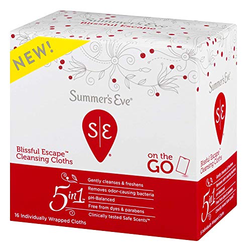 Details: Summer's Eve Blissful Escape Feminine Cleansing Cloths feature a fruity, floral fragrance with invigorating, vibrant berry notes. 5 Ways for Freshness To Go -- That less-than-fresh feeling doesn't always wait for when you have time to hop in the shower. So we created Summer's Eve Feminine Cleansing Cloths - perfect for those in-between times, like after the gym or as a quick refresher between work and happy hour. Individually wrapped for convenience, only Summer's Eve Feminine Cleansing Cloths give you 5 fresh benefits in 1 luxe cloth: 1. Clinically Tested Safe Scents, 2. Removes odor-causing bacteria, 3. pH-Balanced, 4. Free from dyes and parabens, and 5. Gently cleanses & freshens. Even better, it's gynecologist tested and safe for everyday use. So stash them in your purse or gym bag, we promise we'll make more! Summer's Eve Feminine Cleansing Cloths and Summer's Eve Feminine Cleansing Wash are available in a variety of different fragrances on Amazon.com. Ingredients: Water/Eau, Glycerin, Lactic Acid, Potassium Sorbate, Sodium Citrate, Sodium Benzoate, Decyl Glucoside, Disodium EDTA, Polysorbate 20, Fragrance/Parfurn.