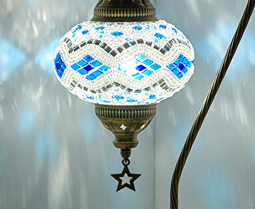 Details: "Demmex Turkish Lights". Widest Selection of Turkish Lamps on Amazon. Handmade in Turkey for US Use. Handmade Mosaic Glass Turkish Moroccan Table Night Lamp. COLOR : WHITE & BLUE Globe Diameter : 18cm (7") Height : 42cm (16.5") Antique Brass Color Engraved Metal Body. Handmade in Turkey. US Compatible. Uses E12 Bulb. Not Included. (Watt Depends on Your Liking. More Watt Means More Light).. COLOR : WHITE & BLUE