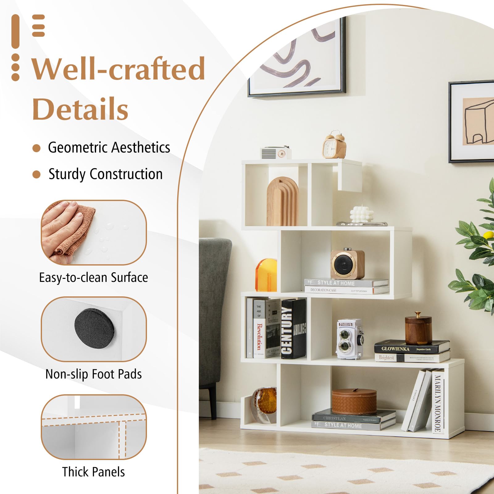 - Elegant S-Shaped Design: Embrace the blend of functionality and flair with this 5-tier Z-shelf bookcase that adds a contemporary twist to your space. Its unique S-shaped design makes an artistic display for your treasured collections.
