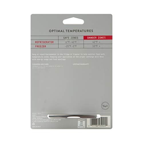 Details: Keep your frozen and refrigerated items at the proper temperature with this Freezer/Refrigerator Thermometer from Taylor. The extra-large, 3-inch dial features a glass lens and red pointer, making this analog thermometer's accurate measurements easy to read. This freezer/refrigerator thermometer has a range of -20 to 80 ° F. Colorful graphics with safe temperature zone indicators ensure your food is kept at the proper temperature range at all times, while the durable stainless steel casing provides strength and corrosion resistance. This appliance thermometer's unique design has the ability to either hang from a shelf or stand on its own, making it the perfect addition to any home fridge or freezer.