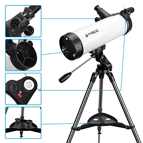 - POWERFUL REFLECTOR TELESCOPE: The 114mm Newtonian Telescope is a powerful and user-friendly reflector telescope. Aperture: 114mm(4. 5"), Focal Length: 500mm. It features fully-coated glass optics, a sturdy and lightweight frame, two eyepieces, a Star Pointer red dot finder scope and an adjustable tripod.