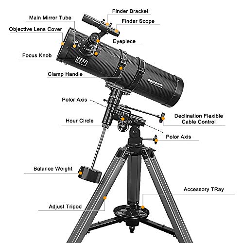 Details: Telescope, Polaris 130EQ Newtonian Professional Astronomical Reflector Telescope Comes with Cellphone Adapter with 1.5X Barlow Lens & 1.25-Inch 13 Percent Transmission Moon Filter
