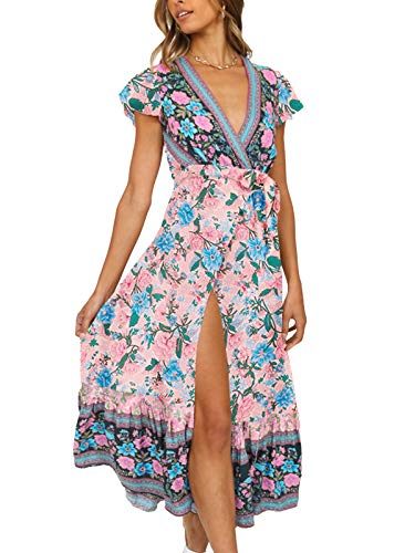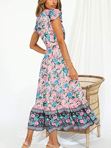 TEMOFON Women's Dresses Bohemian Floral Printed V-Neck High Split Summer Short Sleeve Ethnic Maxi Dress S-XL