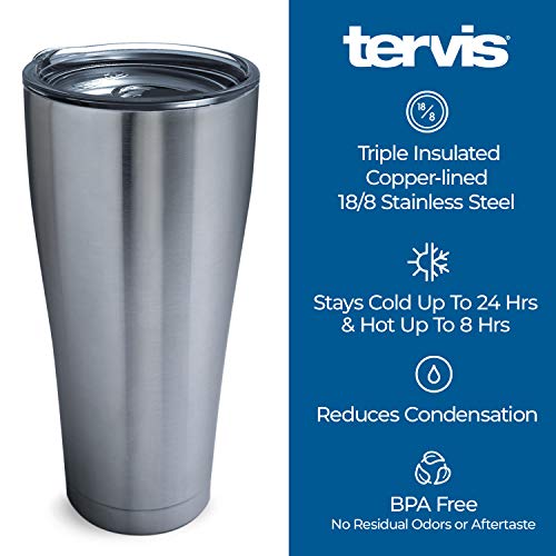 Details: This double-walled tumbler offers all the benefits of stainless steel and can be enjoyed with legendary and beloved exclusive Tervis designs Splash-proof shatter-proof and easy-close lid Up to 24 hours ice cold or 8 hours piping hot Comes with a standard lid and a Limited 5-Year