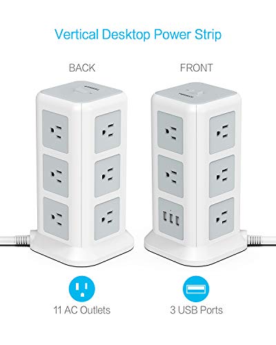 - DESKTOP POWER STRIP TOWER - 11 AC outlets surge protector with 3 USB ports. Single USB charger can charge up to 2.4A, fit for cell phones, tablets, and more USB devices. 15A heavy duty extension cord rated 1875W, it can handle most appliances like TV, coffee maker, computer, etc.