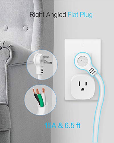 - FLAT PLUG STRIP EXTENSION CORD - The flat plug features a low profile fit in tight spots behind bed, nightstand, bookshelves, or couch. 45 degrees angled design doesn’t block the other wall outlet. The 6.5 ft extension cord can get easy access to the place that’s hard to reach.