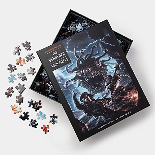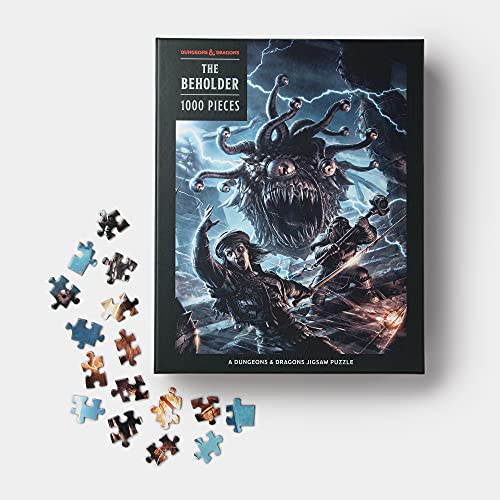 Details: About the Author Dungeons & Dragons launched the great tradition of roleplaying games in 1974 with an unprecedented mix of adventure and strategy, dice-rolling, and storytelling. Wizards of the Coast continues to honor that tradition, bringing to market a diverse range of D&D game and entertainment experiences and influencing numerous writers, directors, and game designers by tapping into an innate human need to gather with friends and tell an exciting story together. Product Description Featuring a terrifying beholder, this officially licensed Dungeons & Dragons jigsaw puzzle is a great challenge for adventurers across the Realms. Piece together the "eye-conic" cover art from The Monster Manual. Covered with eyes, armed with teeth, and protected by multiple forms of magic, this beholder lies ready to attack all who venture into the deepest caves and tunnels of the Underdark. With a finished size of 20 x 27 inches, this 1,000-piece jigsaw puzzle promises hours of fun packaged in one sturdy box.