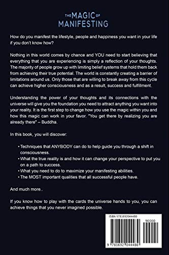 Details: Product Description Why Celebrities Swear by These 15 Powerful Techniques As The Secret to Anything You Want in Life Do you easily complain or start nagging whenever something isn’t going your way? Do you give fault and make others responsible for your misery? Are you annoyed looking around seeing others having exactly what you want in life? Believe it or not, you are the driver of your own life and no one else can steal your seat...if you don’t let them. What if there were straight-forward, easy principles to get everything you want in life? Maybe you already manifest regularly or you’ve heard of it, but never tried it. Manifesting means using the power of your thoughts, feelings or beliefs to bring something into your physical reality. At first, it sounds abstract, but science has proven, everything is made of energy: objects, animals, thoughts, and humans. There are laws that control how this energy flows and where it goes just as there are laws of gravity and laws of growth. The more you know about these laws the easier it is to navigate the energy you need in the right direction. No wonder that even stars like Will Smith, Jim Carrey, Oprah Winfrey, and Lady Gaga swear by manifestation as the secret to their success. Jim Carrey makes it sound really simple. He says: “As far as I can tell, it’s just about letting the universe know what you want and then working towards it while letting go of how it comes to pass.” Yet, there are reasons why some people are better at manifesting than others. There are a couple of fundamentals you need to understand in order to apply manifestation effectively. With a little guidance and the right techniques, your best life is waiting for you. This is only a select sample of what you’ll discover in The Magic of Manifesting: Flap or Fab: Why you should care about manifestation more than you think The scientific secret behind changing your reality Why you might be manifesting your misery and how to avoid these common mistakes The smartest and most powerful way to attract anything you want in life How scientists manipulate your life with one particular weakness that outweighs all of science’s strengths (check page 27) Is everything connected? Essentials about energy, flow, and connection Why your ego is the enemy and what you can do about it 15 techniques to guarantee your manifestation success story The #1 mental exercise Olympians and star athletes practice daily to increase their performance Intention vs. goals: The major difference and which is best to achieve success in life The biggest money lie revealed (check page 102) and how to create true abundance Warning Signs that you have a scarcity mindset and how to get rid of it And much more. If you think “manifesting” is just another 2020 buzzword, then you haven’t heard the success stories of millions of people who made their dreams come true with this one powerful tool. It goes from 6-year-old Kabir who manifested to become the Malaysian David Copperfield and got invited to perform in The Magic Castle in Hollywood to family father Daniel who manifested his dream house in Maui. You don’t have to be famous to be successful in life. These are average people, with average IQs and the natural power to manifest. Stop waiting for life to happen to you and start creating your best life right now. If you want to effortlessly get what you want, scroll up and click the “Add to Cart” button. Review "I have read your book "The Magic of Manifesting". I can say it one of the greatest books on the law of attraction I have read in recent times. I love the simplicity and the scientific approach, it is indeed the reality of 'reality'." - Ameh Emmanual About the Author Metaphysics researcher and philosopher with a passion for learning, understanding, and teaching about the hidden laws of life.