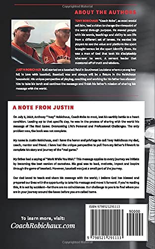 Details: On July 3, 2019, our father lost his earthly battle to a heart condition. Leading up to that specific day, he was in the process of sharing with the world his message of The Real Game: Overcoming Life’s Personal and Professional Challenges. The only problem was, the book was not complete. My name is Justin Robichaux and I have the honor and privilege to call Tony Robichaux my dad, coach, mentor and friend. I have had the unique perspective to pull from my father’s lifework to complete his story and journey of the “real game.” My father had a saying of “Work While You Wait.” This message applies to every journey we initiate by becoming the best version of ourselves. His goal was to lead, motivate, impact and inspire through the game of baseball. However, baseball was just a small part of the journey. Our dad loved to teach and share his message with the world; I believe God has blessed and prepared our lives with the opportunity to take his message and move it forward. If you’re reading this, it is not by accident—for there are no coincidences. Our challenge to you is to find where you are in your journey around the bases before you are called home.