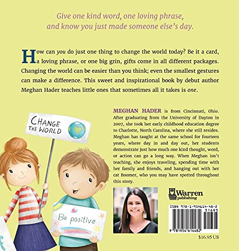 Details: Product Description Give one kind word, one loving phrase, and know you just made someone else's day. How can you do just one thing to change the world today? Be it a card, a loving phrase, or one big grin, gifts come in all different packages. Changing the world can be easier than you think; even the smallest gestures can make a difference. This sweet and inspirational book by debut author Meghan Hader teaches little ones that sometimes all it takes is one. About the Author Meghan Hader is from Cincinnati, Ohio. After graduating from the University of Dayton in 2007, she took her early childhood education degree to Charlotte, North Carolina, where she still resides. Meghan has taught at the same school for fourteen years, where day in and day out, her students demonstrate just how much one kind thought, word, or action can go a long way. When Meghan isn't teaching, she enjoys traveling, spending time with her family and friends, and hanging out with her cat Boomer, who you may have spotted throughout this story.